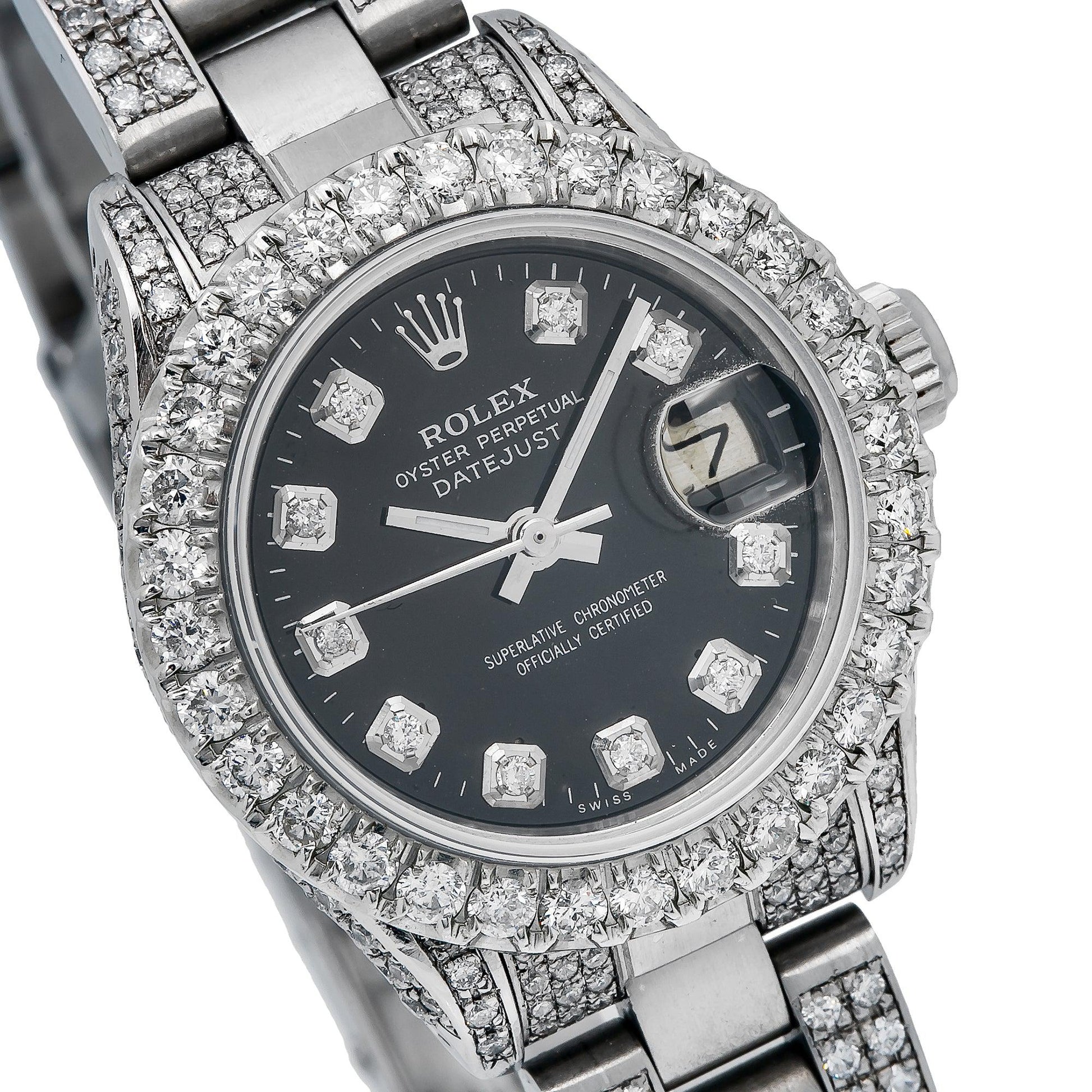 Rolex Datejust 26MM 69160 Black Diamond Dial Diamond Bezel Stainless Steel Semi Diamond Oyster Bracelet 4.25ct