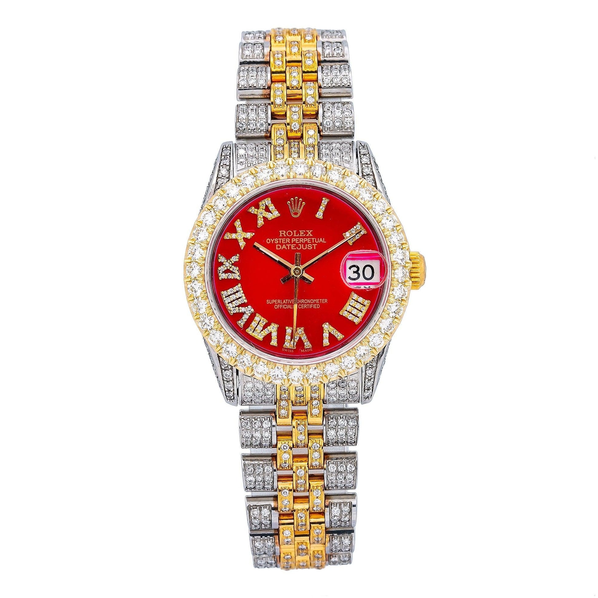 Rolex Datejust 31MM 6827 Red Roman Diamond Dial Diamond Bezel Two Tone Yellow Gold Full Diamond Jubilee Bracelet 7.25ct