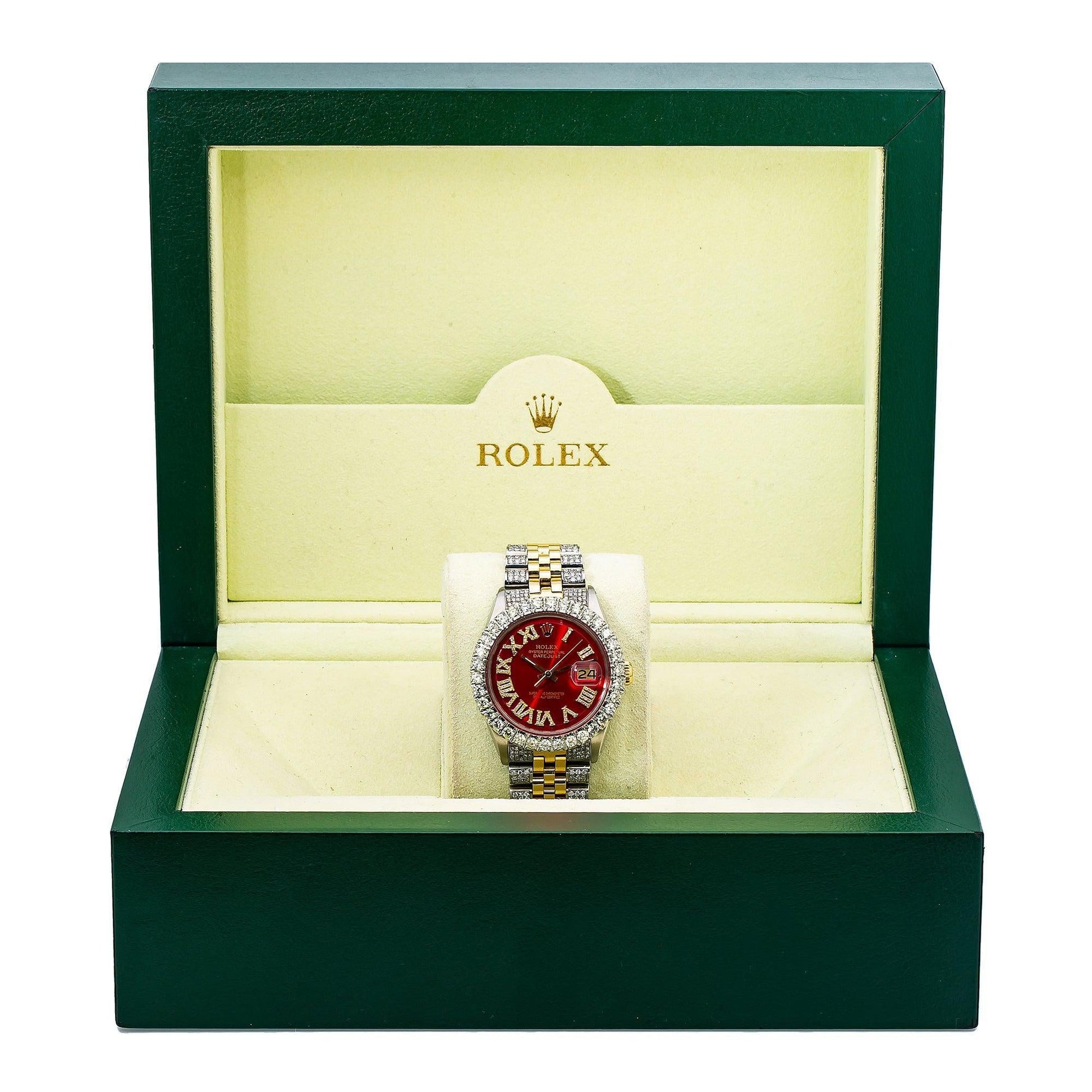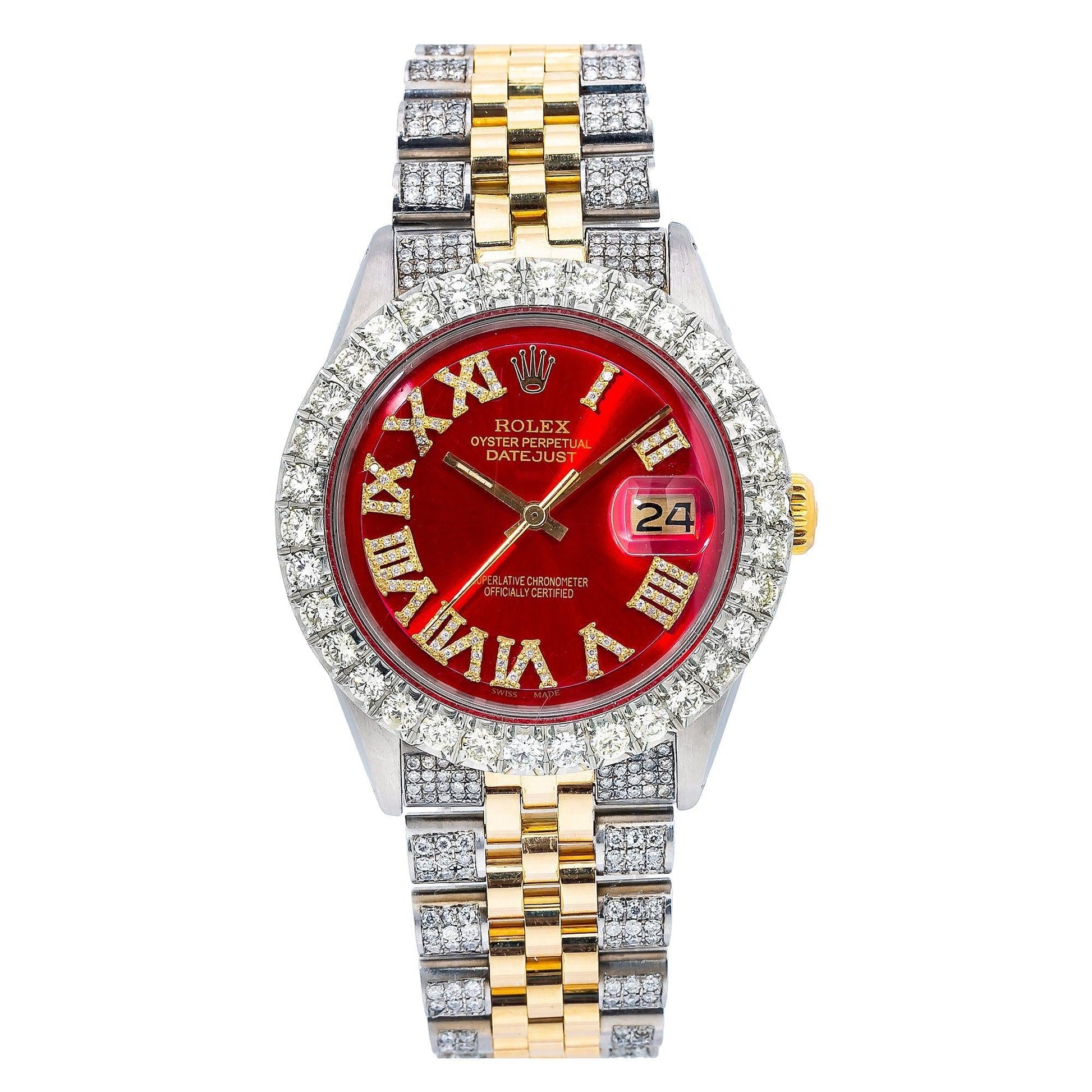 Rolex Datejust 36MM 1601 Red Roman Diamond Dial Diamond Bezel Two Tone Yellow Gold Semi Diamond Jubilee Bracelet