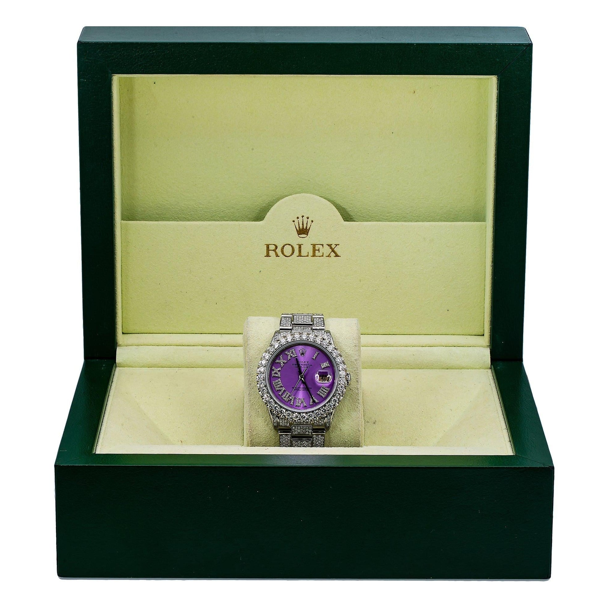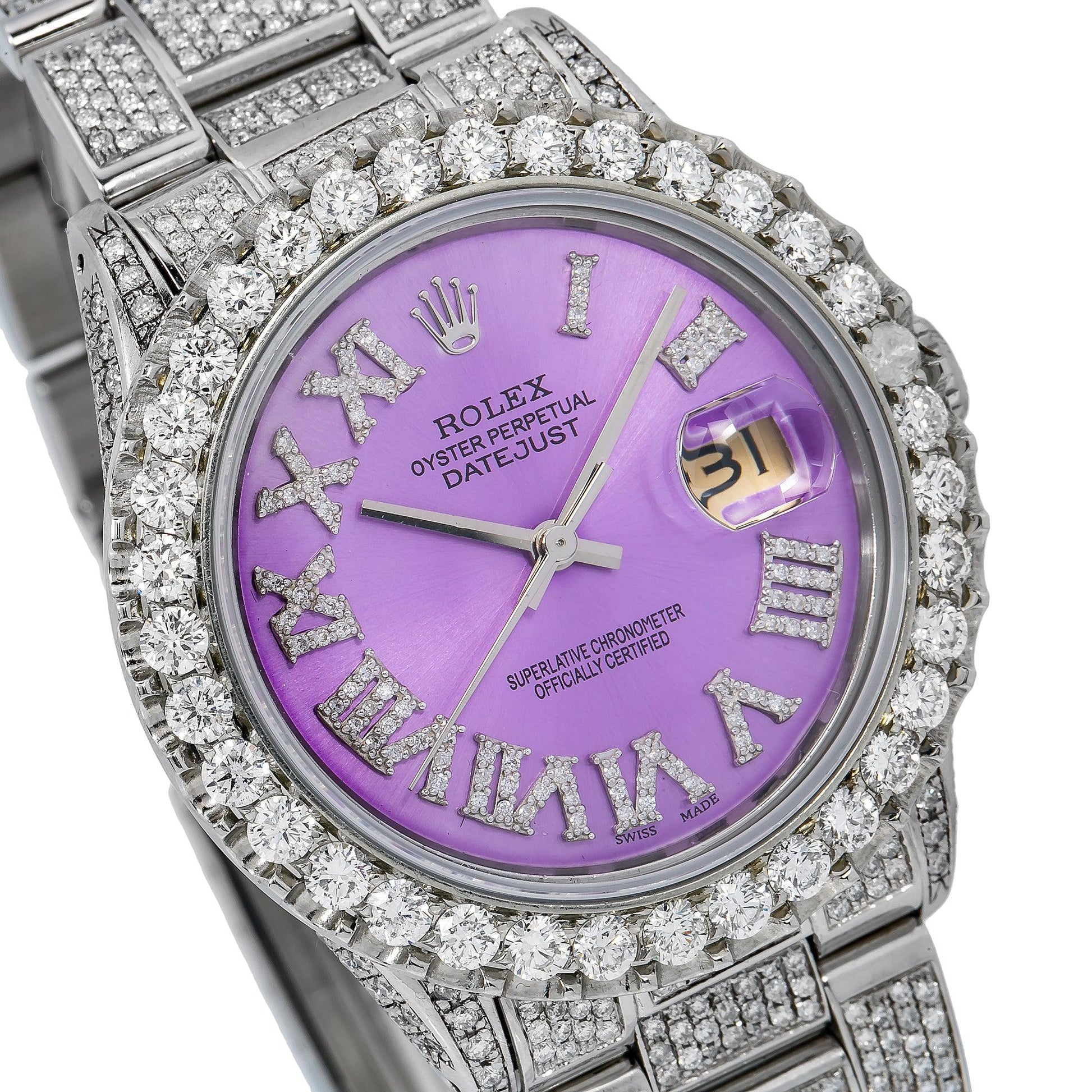 Rolex Datejust 36MM 16200 Purple Roman Diamond Dial Diamond Bezel Stainless Steel Full Diamond Oyster Bracelet 9.25ct