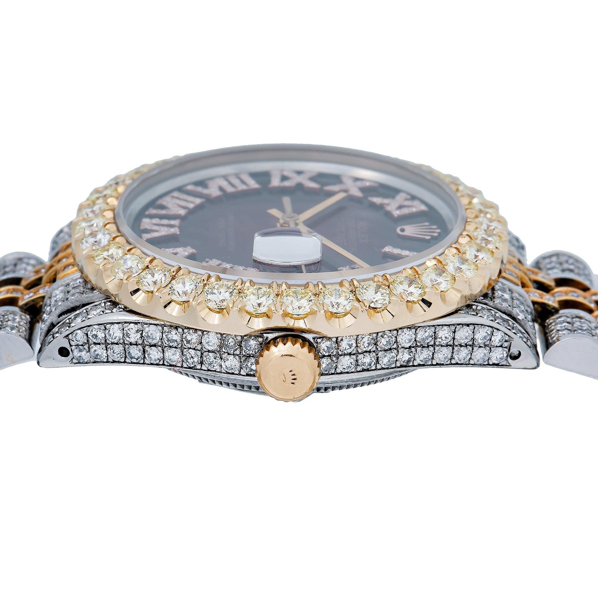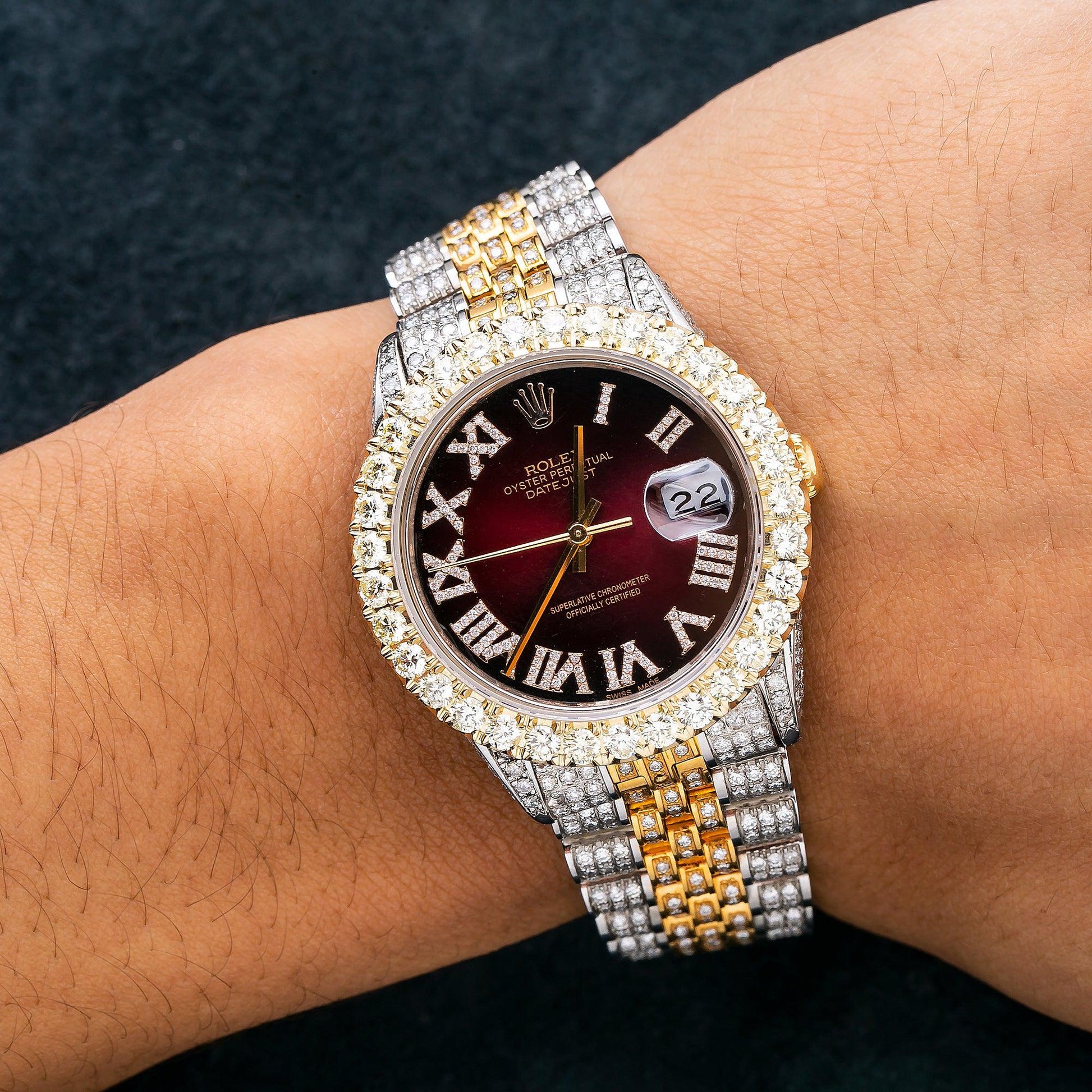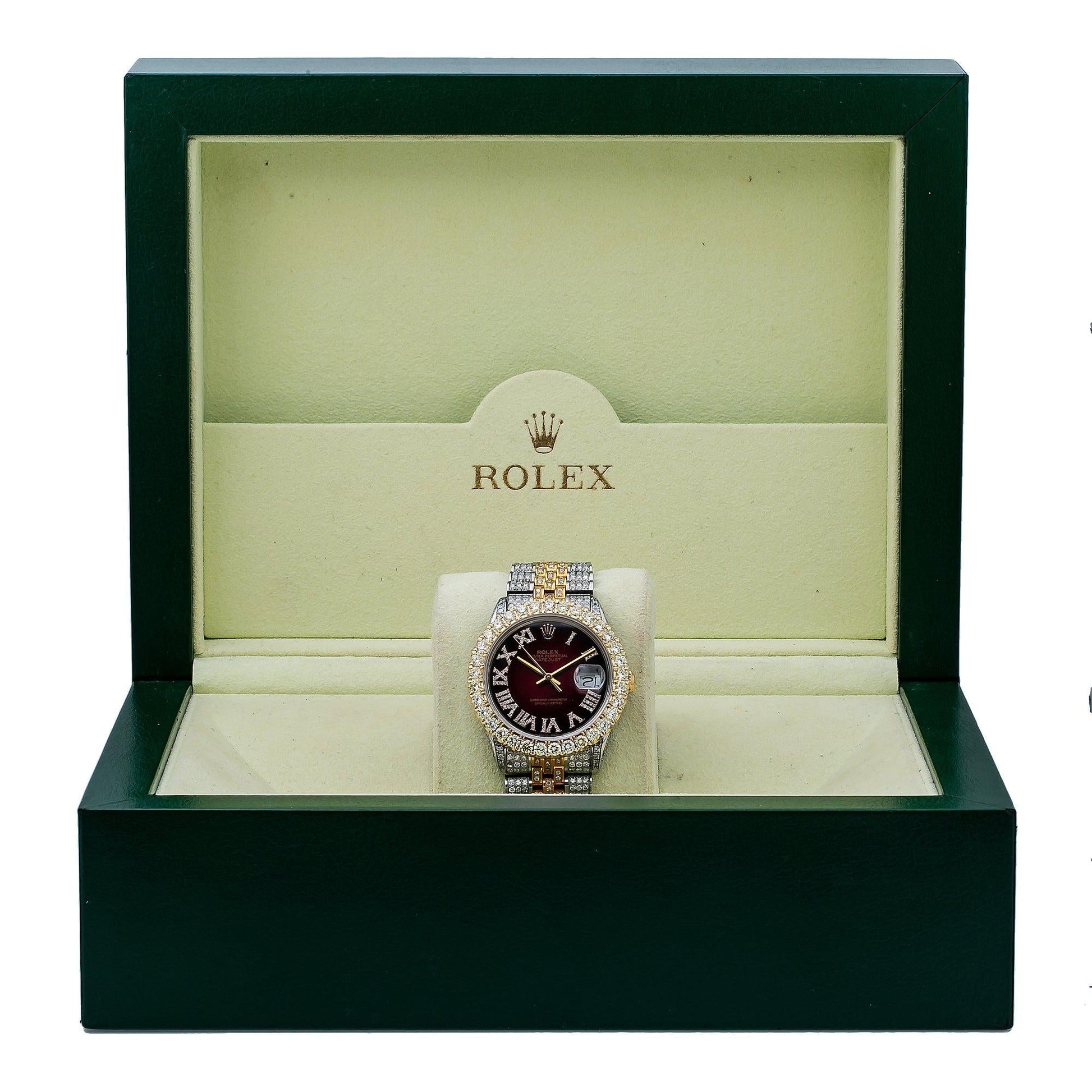 Rolex Datejust 36MM 16233 Red Roman Diamond Dial Diamond Bezel Two Tone Yellow Gold Full Diamond Jubilee Bracelet