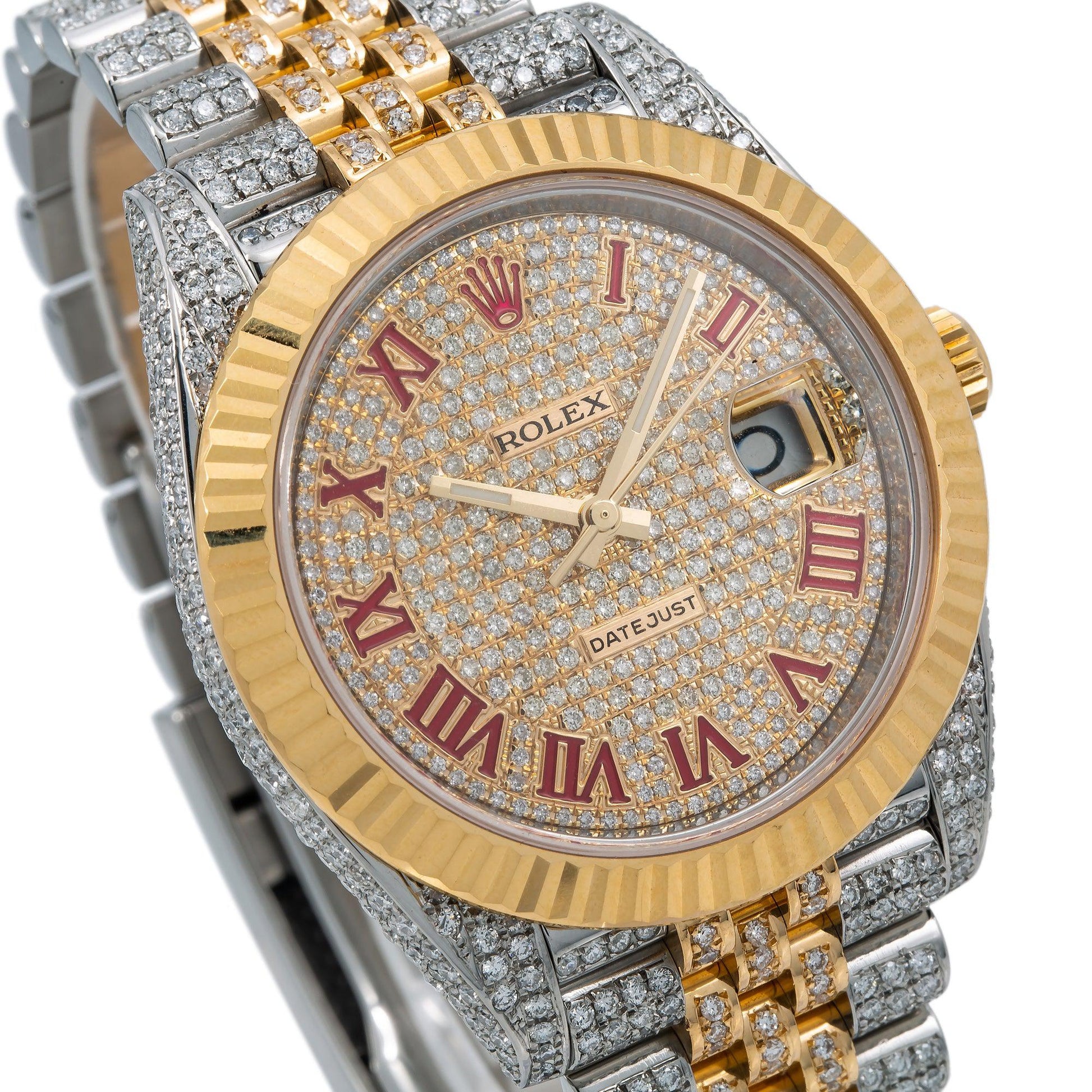 Rolex Datejust 41MM 126333 Diamond Paved Red Roman Dial Fluted Bezel Two Tone Yellow Gold Full Diamond Jubilee Bracelet