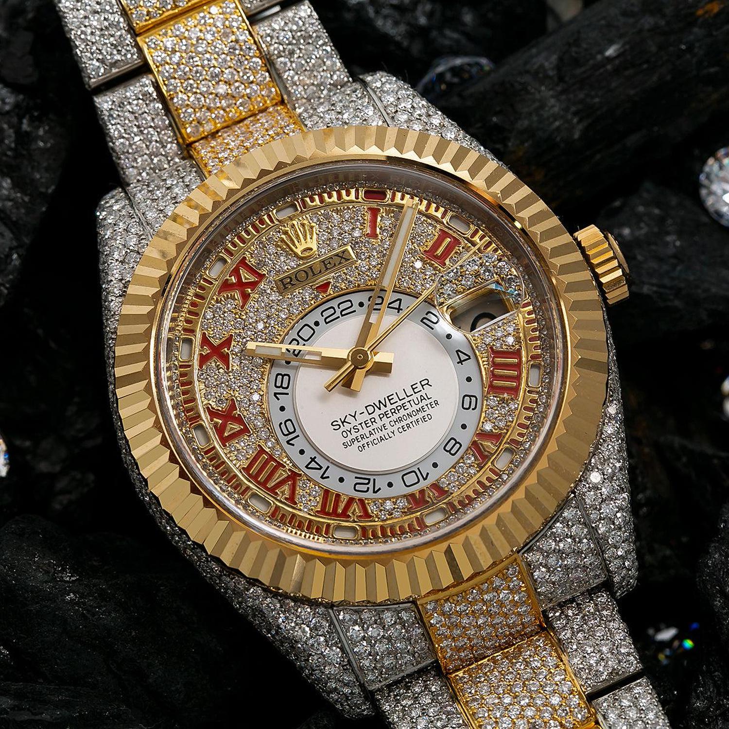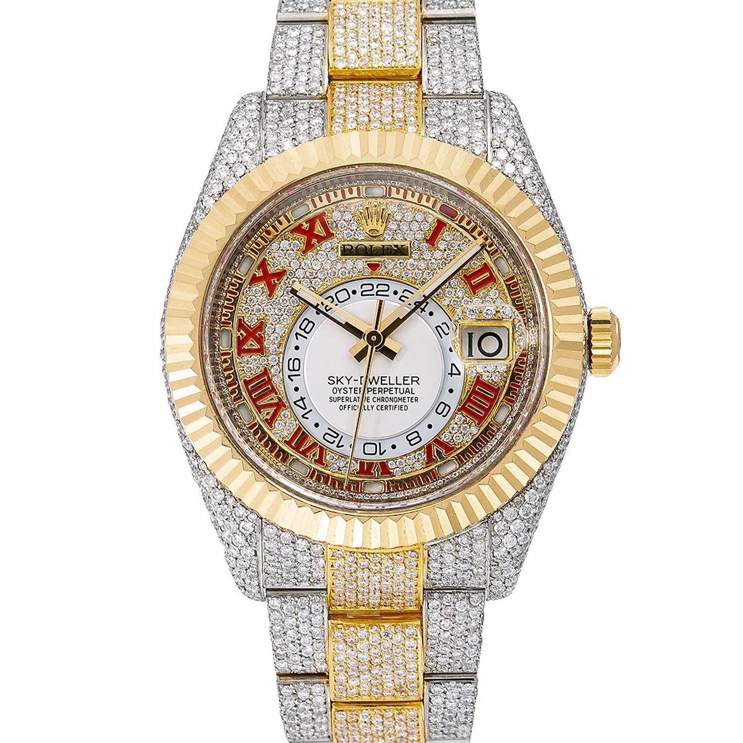Rolex Sky-Dweller 42MM 326933 Diamond Paved Red Roman Dial Fluted Bezel Two Tone Yellow Gold Full Diamond Oyster Bracelet 25.75ct