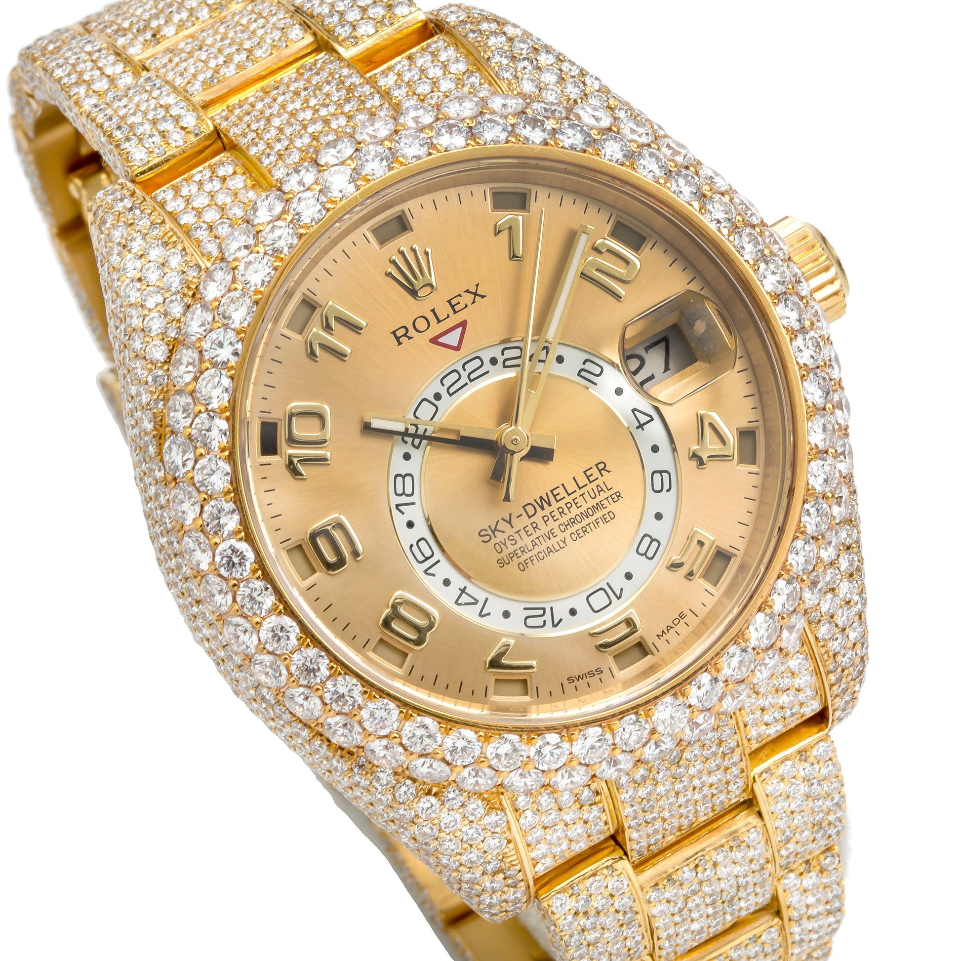 Rolex Sky-Dweller 42MM 326938 Champagne Dial Diamond Bezel 18K Yellow Gold Full Diamond Oyster Bracelet 23.75ct